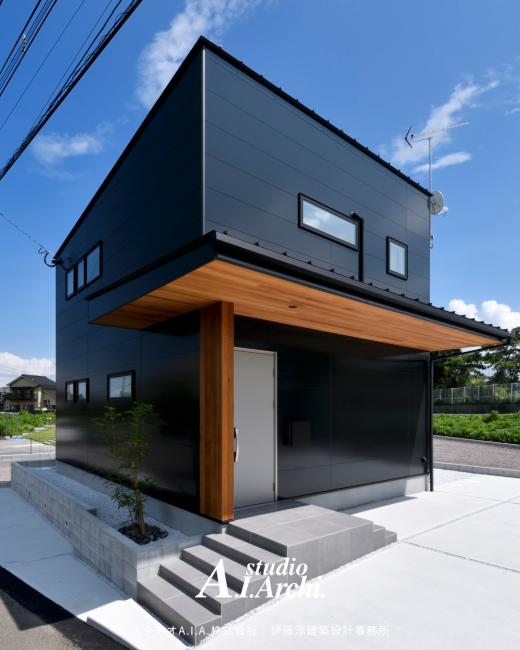 外壁を黒でシックにまとめながら、軒天に木をあしらうことで重くなりすぎず、上質な佇まいを生み出しています。
